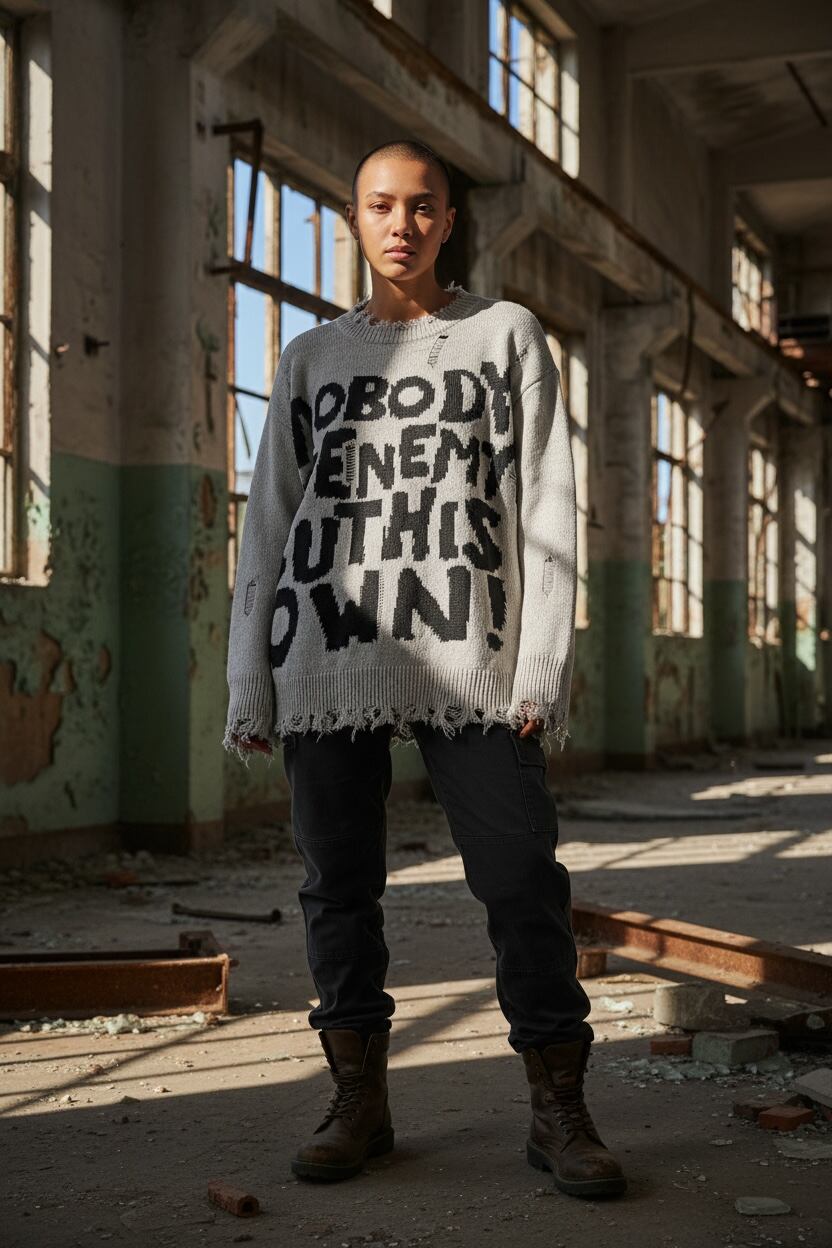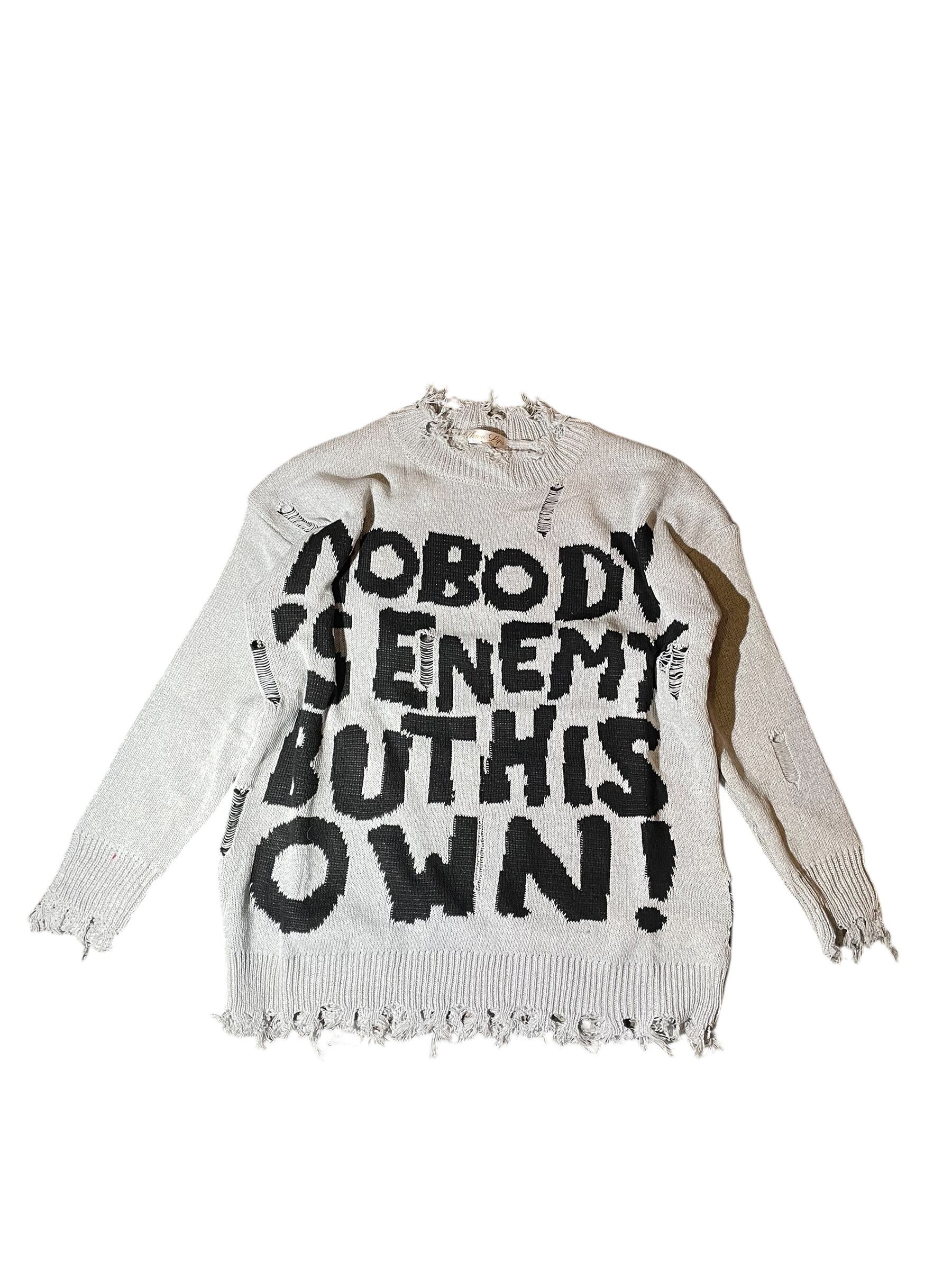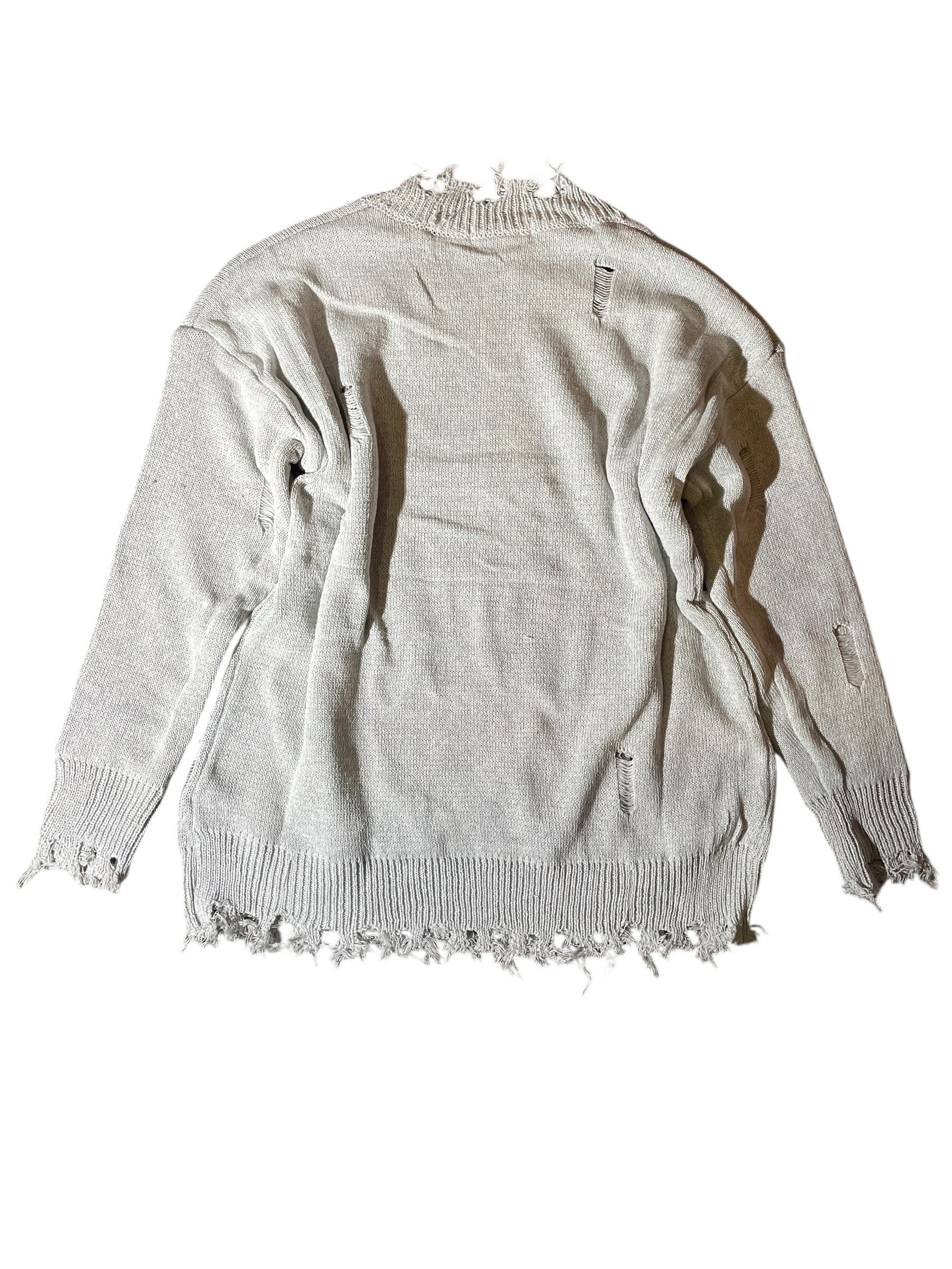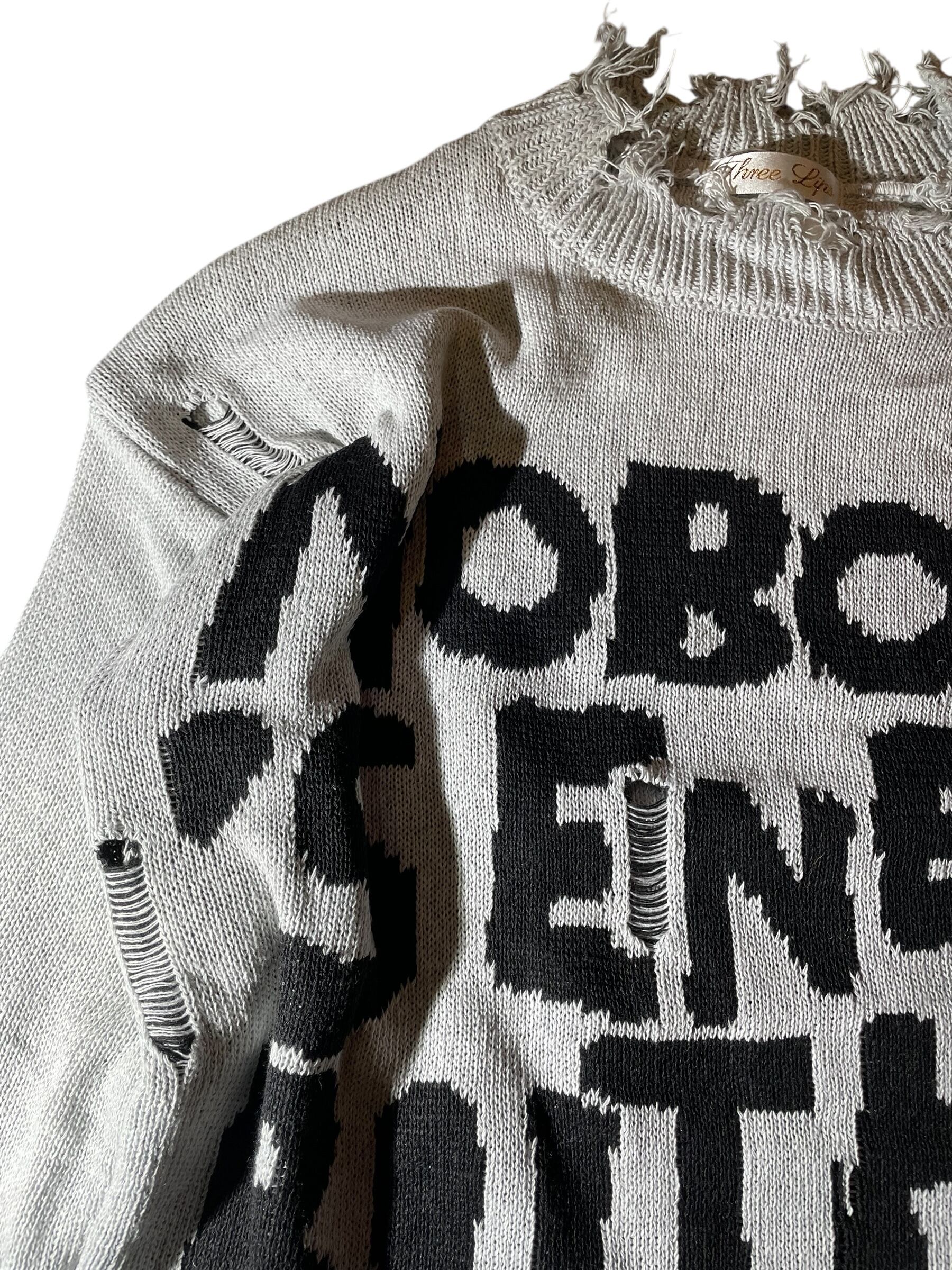 トレンド感満載のダメージグラフィックデザインが施されたニットセーターです。柔らかな素材が肌に優しく、着心地も抜群。独自のダメージ加工が、スタイリッシュな印象を与えてくれます。