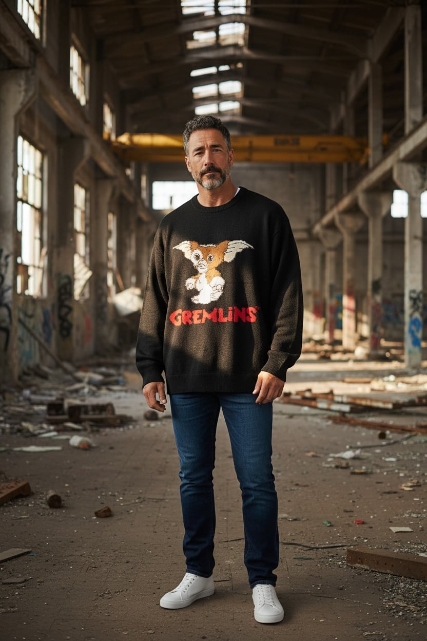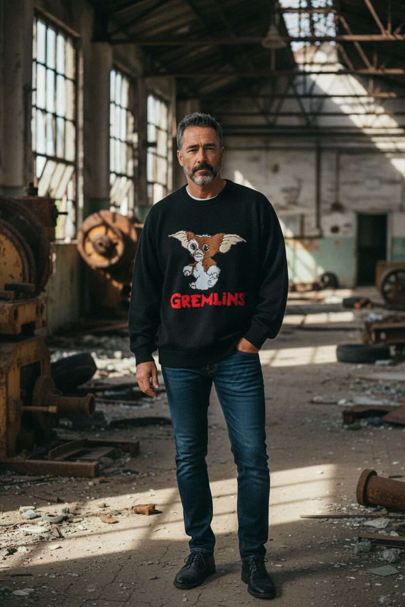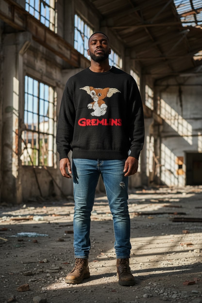 愛らしいギズモのデザインが目を引く、グレムリンファン必見のニットセーターです。ふんわりとしたシャギー素材が特徴で、柔らかな着心地を実現。大きなギズモの印刷が、あなたのコーディネートに遊び心を添えます!