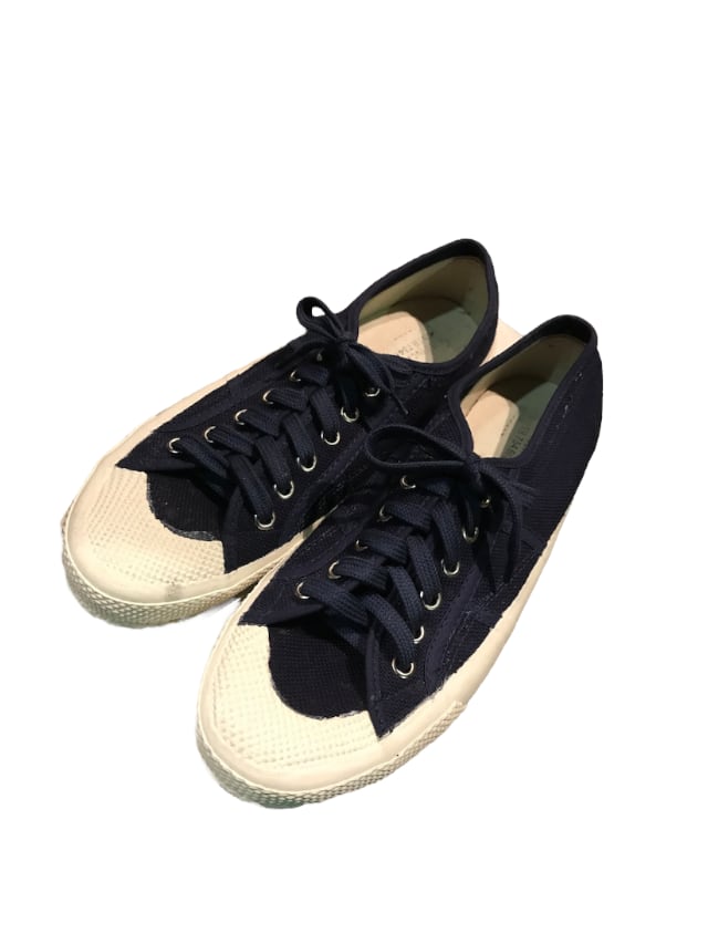 「イタリア海軍のキャンバススニーカーになります。現在ではあまり見かけないヴァルカナイズド製法(接着剤を使わずにゴムの靴底とアッパー部分を熱処理でくっ付ける。)で作られたスニーカーです。クラシックなデザインのスニーカーですが、インソールにはクッション性もあり履き心地も抜群です。」