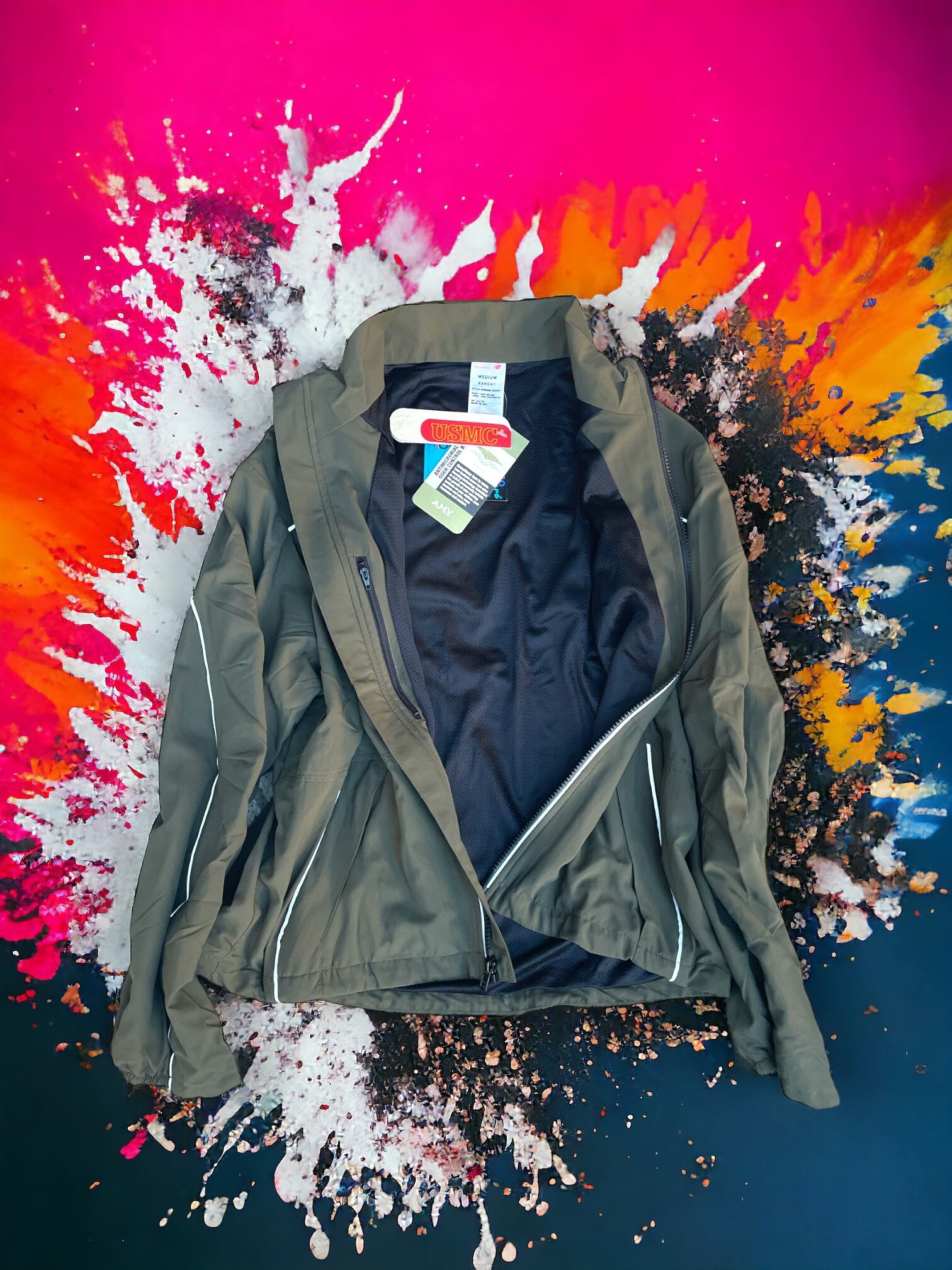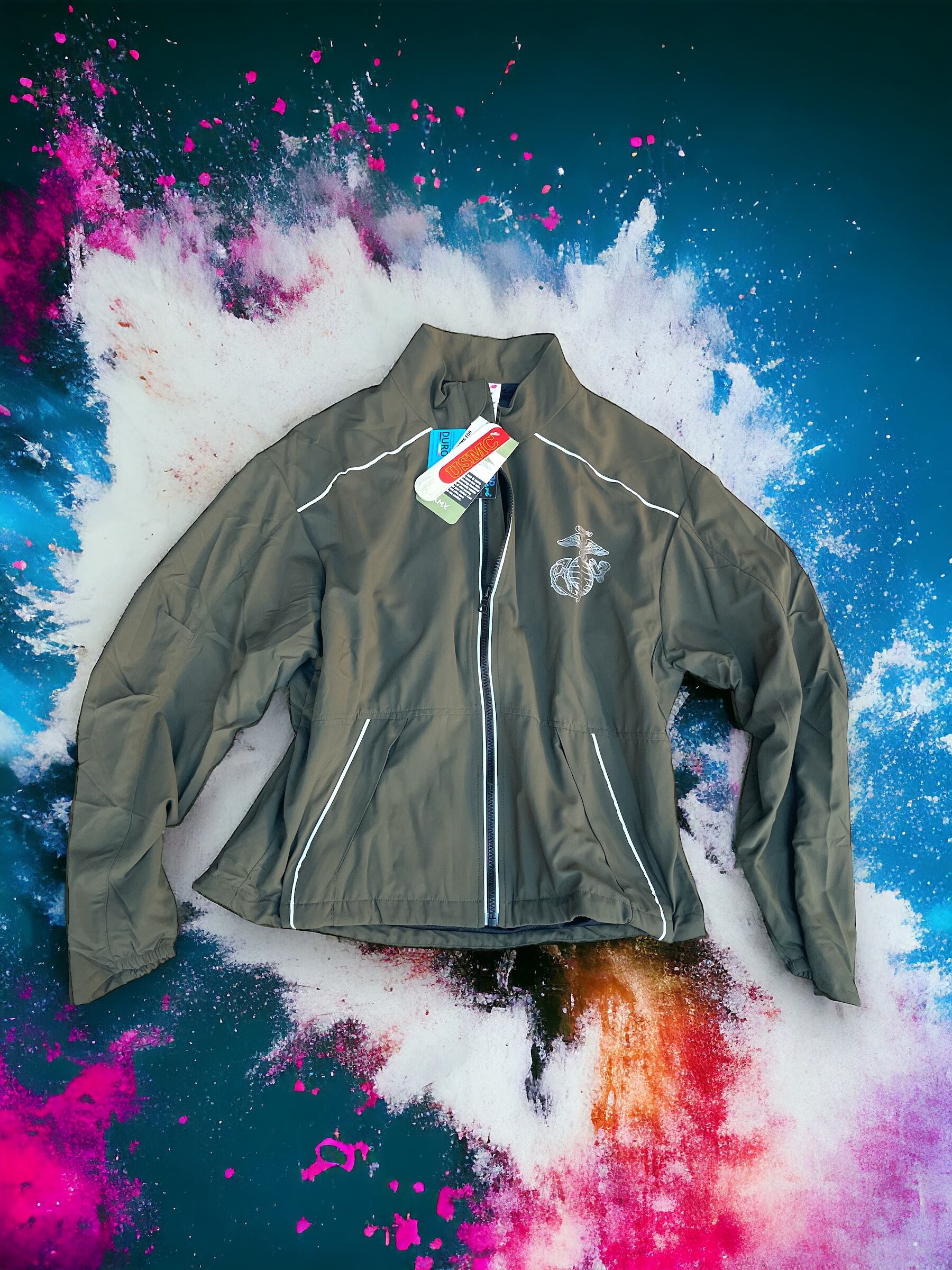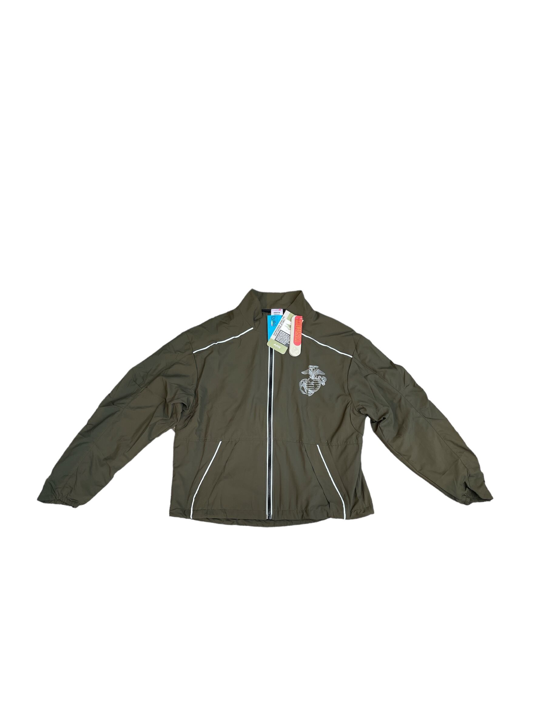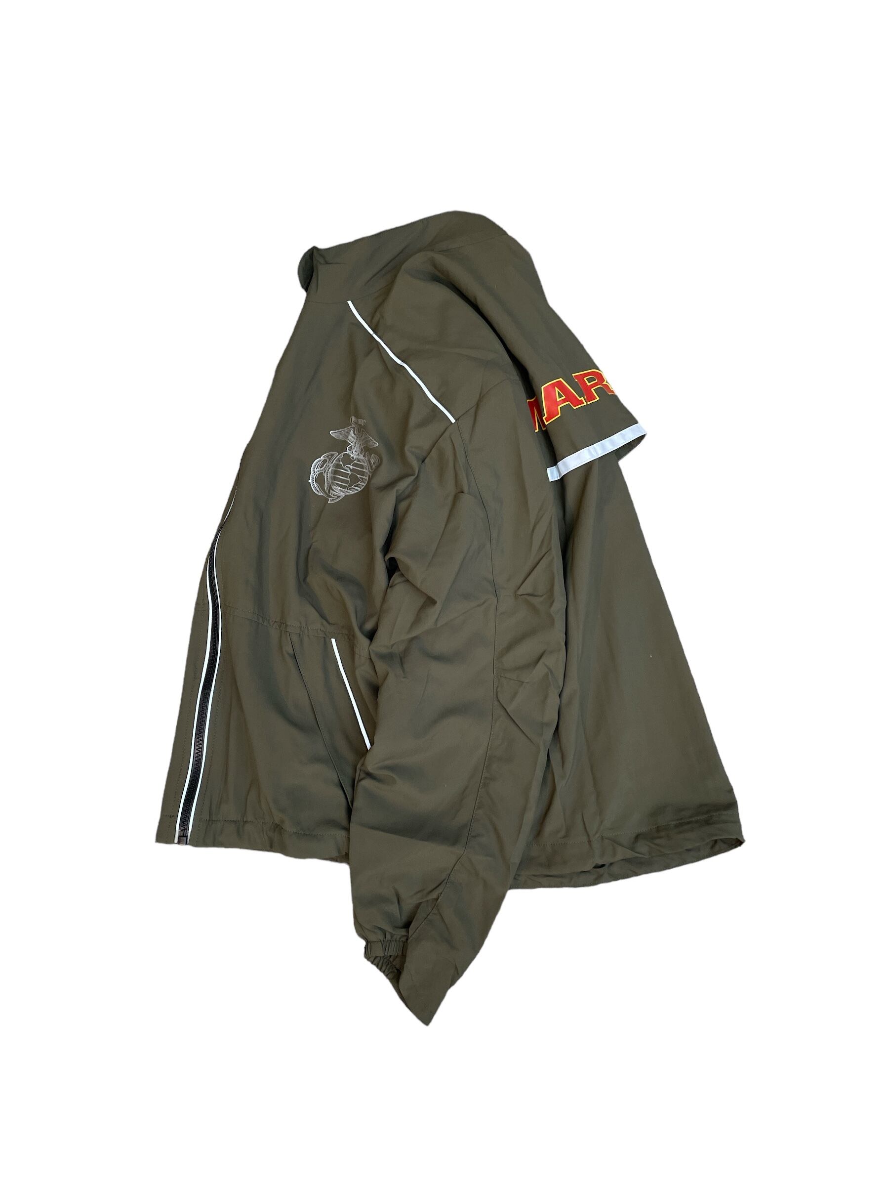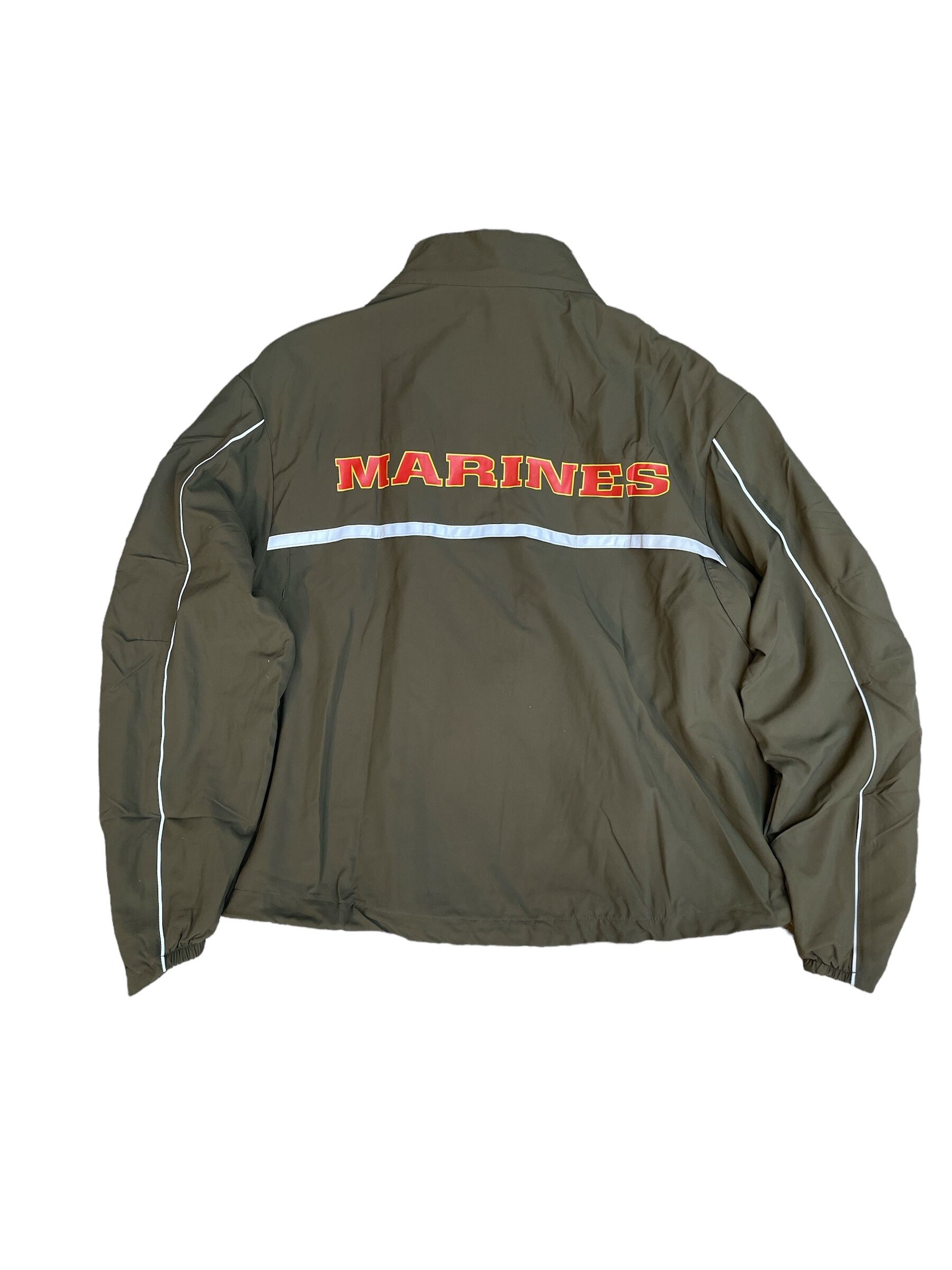 左胸に海兵隊ロゴのリフレクタープリント、背中に「MARINES」の文字がプリントされています。ジャケットのフロントジッパー両サイドや、背面、袖にリフレクターのパイピングを施し、夜間でも視認性の高い仕様。