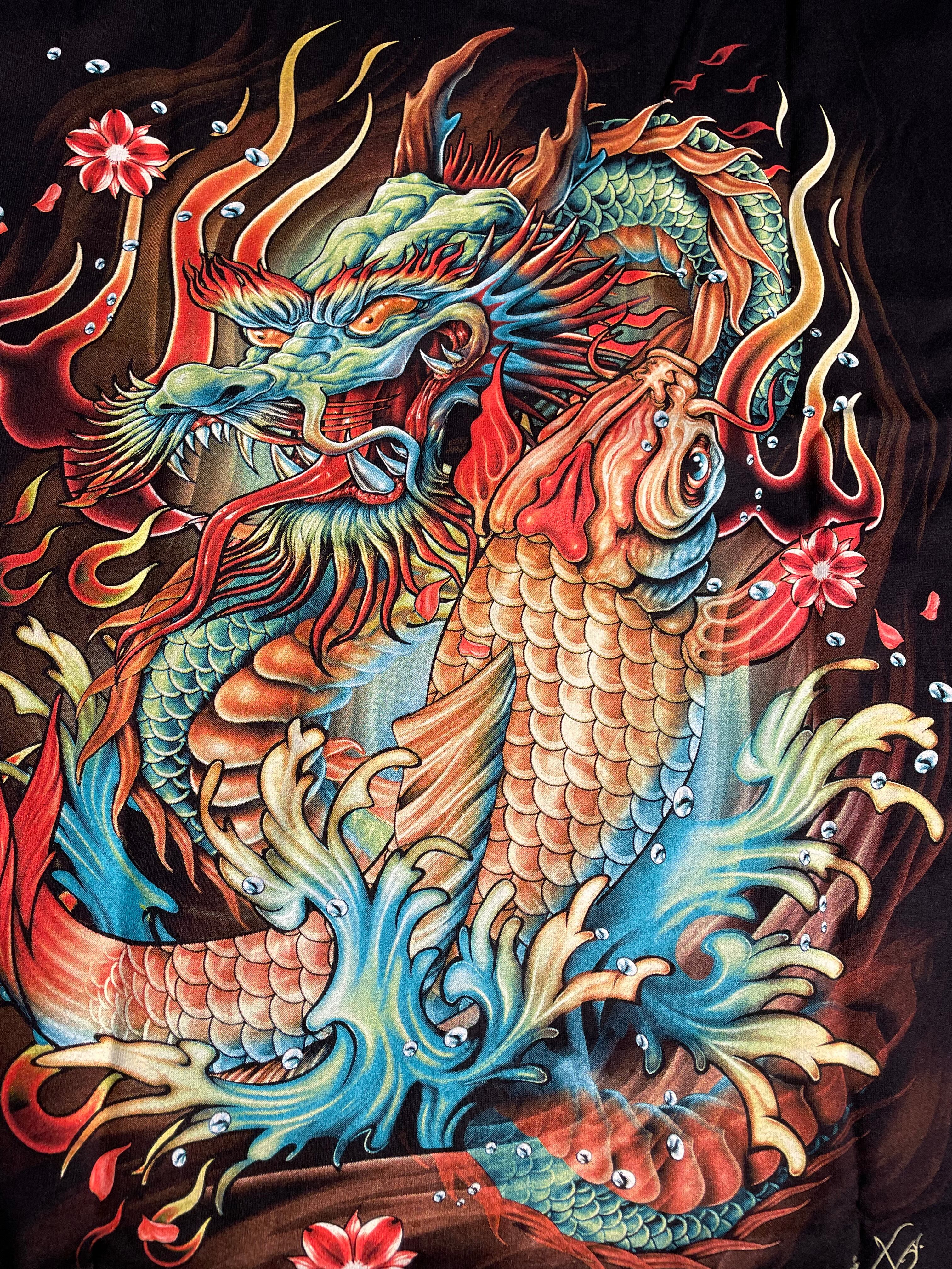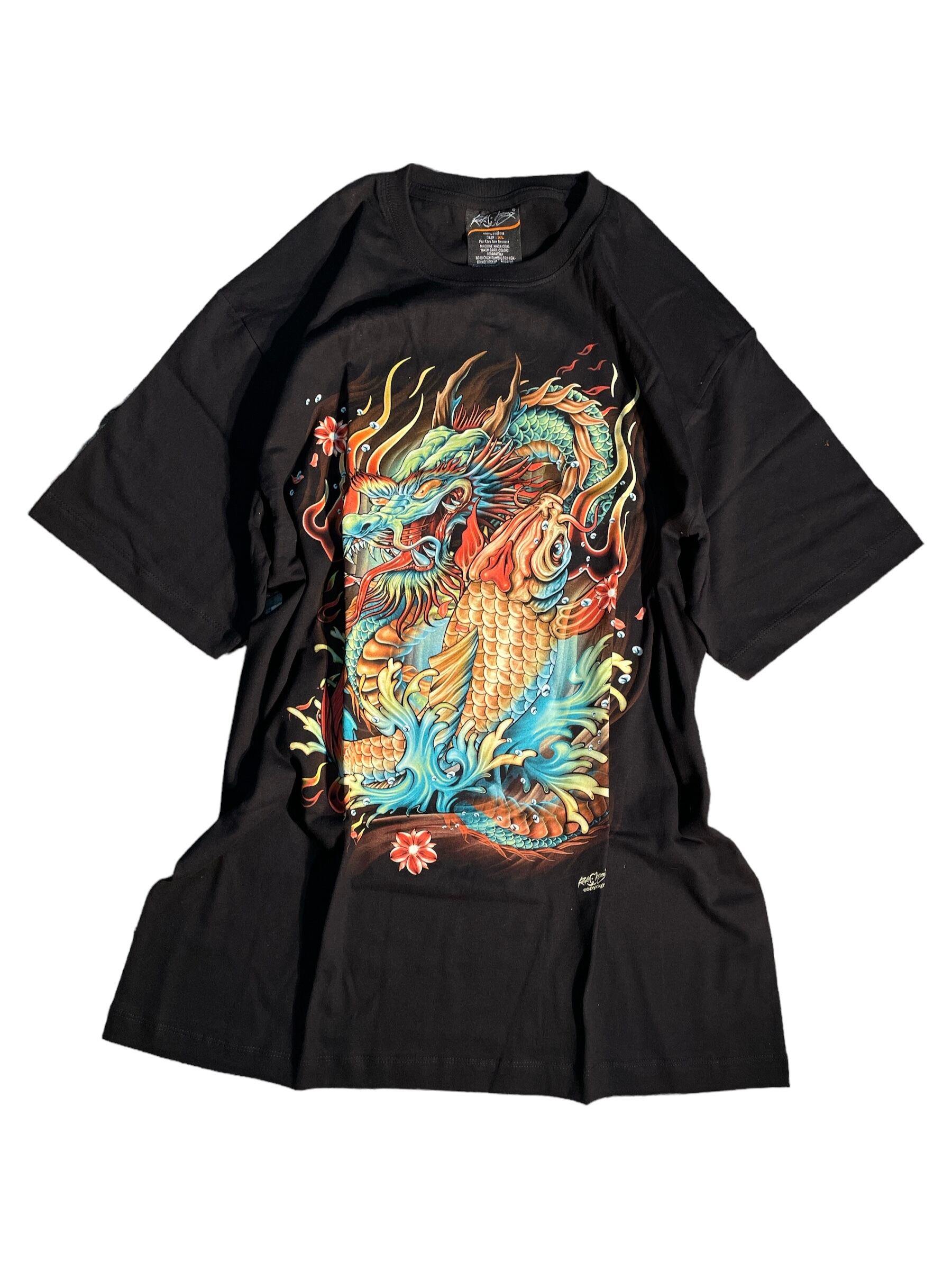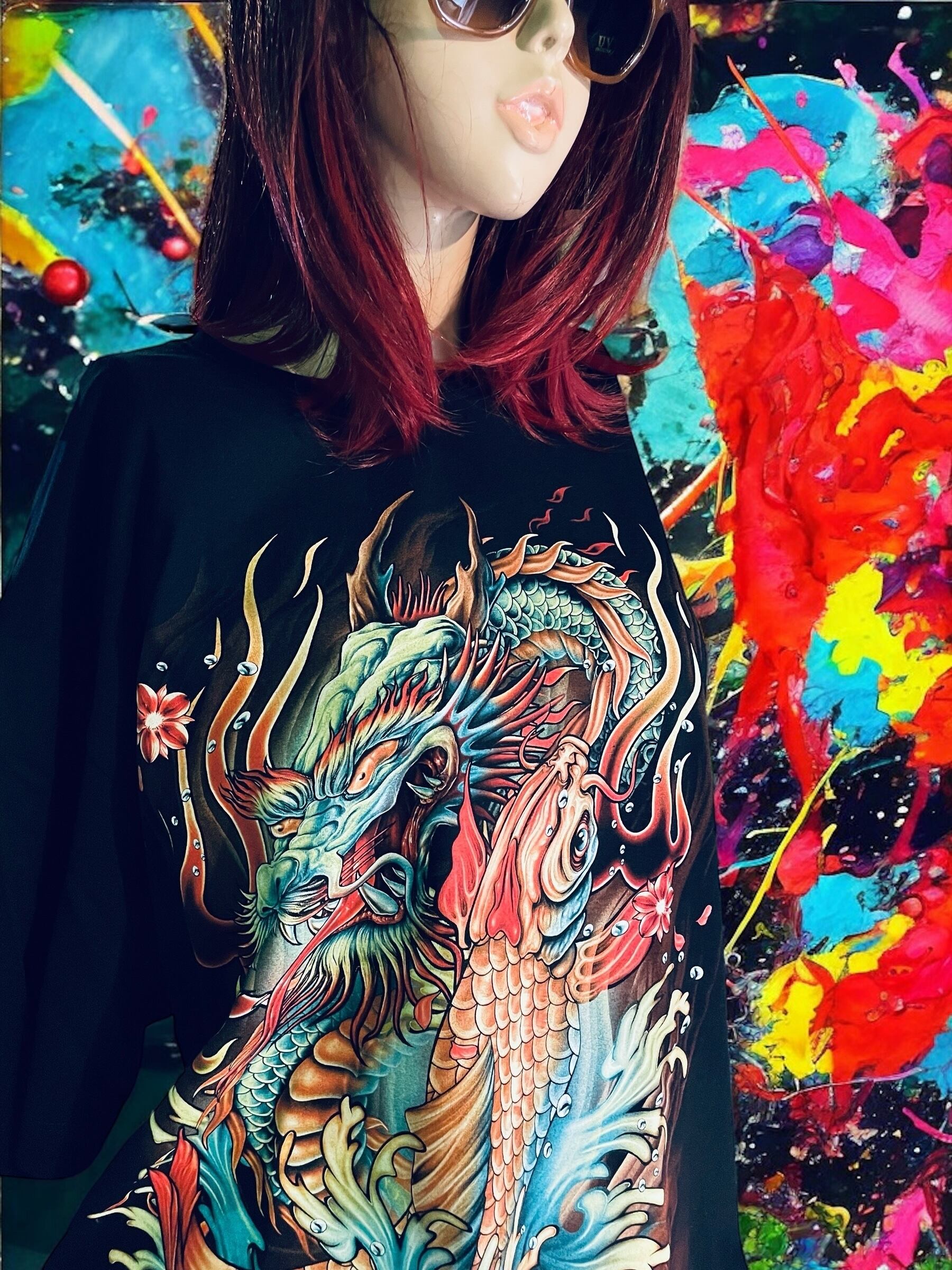 迫力のあるラバープリントで高解像度な鯉と龍Tシャツ