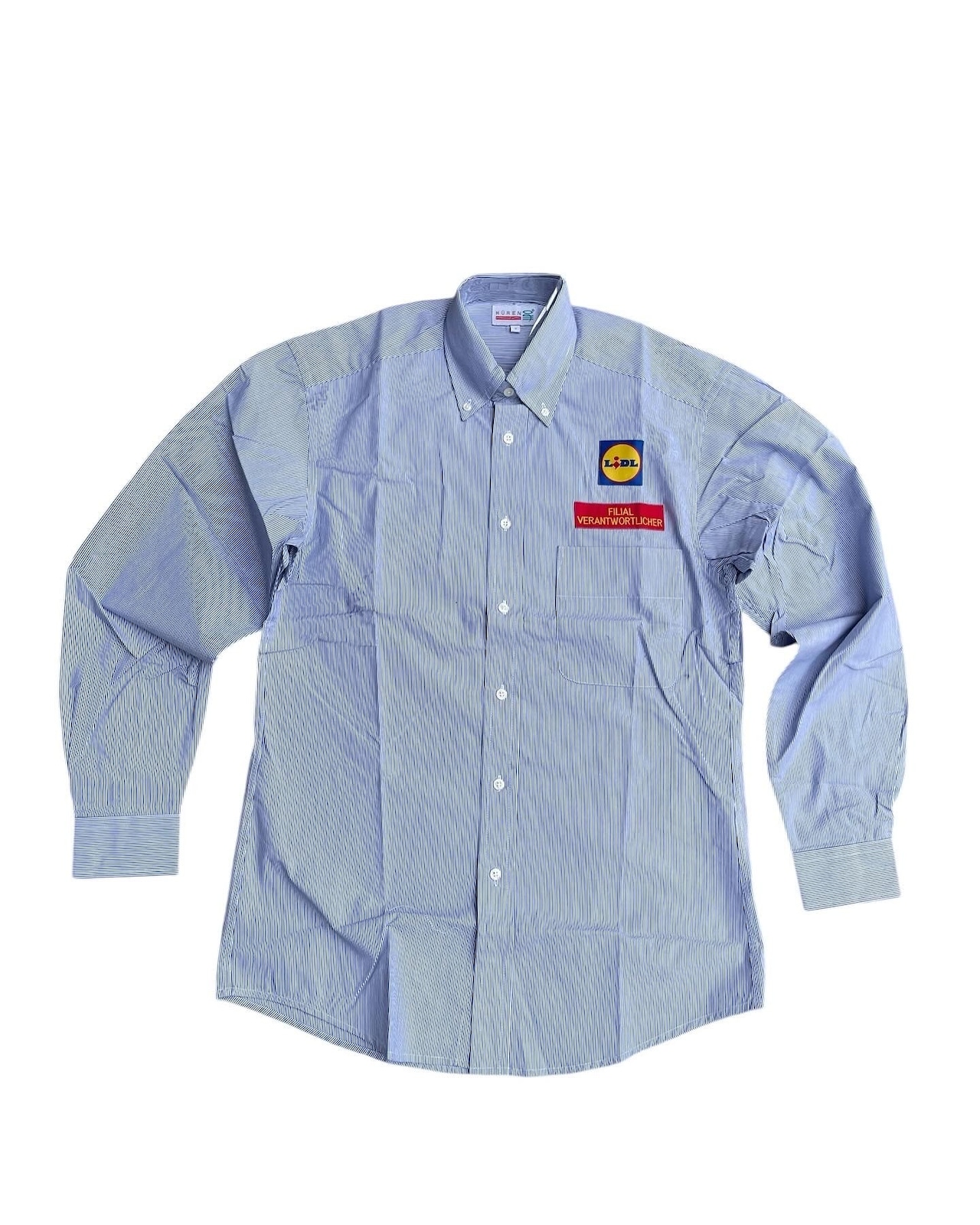 ヨーロッパに展開されているスーパー"Lidl"のカッターシャツが入荷しました。 さわやかな青と白の細ストライプに、Lidlのロゴのワッペンが施されています。 BtypeはLidlのワッペンにドイツ語で「filial verantworlicher」(支店長)と書かれた赤が効いたワッペンもついています。 襟元はボタンダウンタイプで、身頃は表前立てで左胸ポケットが1つ。 後ろ身頃はサイドプリーツ、袖元はラウンドでコンバーチブルカフス仕様です。 カフスボタンやワッペンの追加などオリジナルのカスタマイズで綺麗めからカジュアルまで遊べる1枚です。