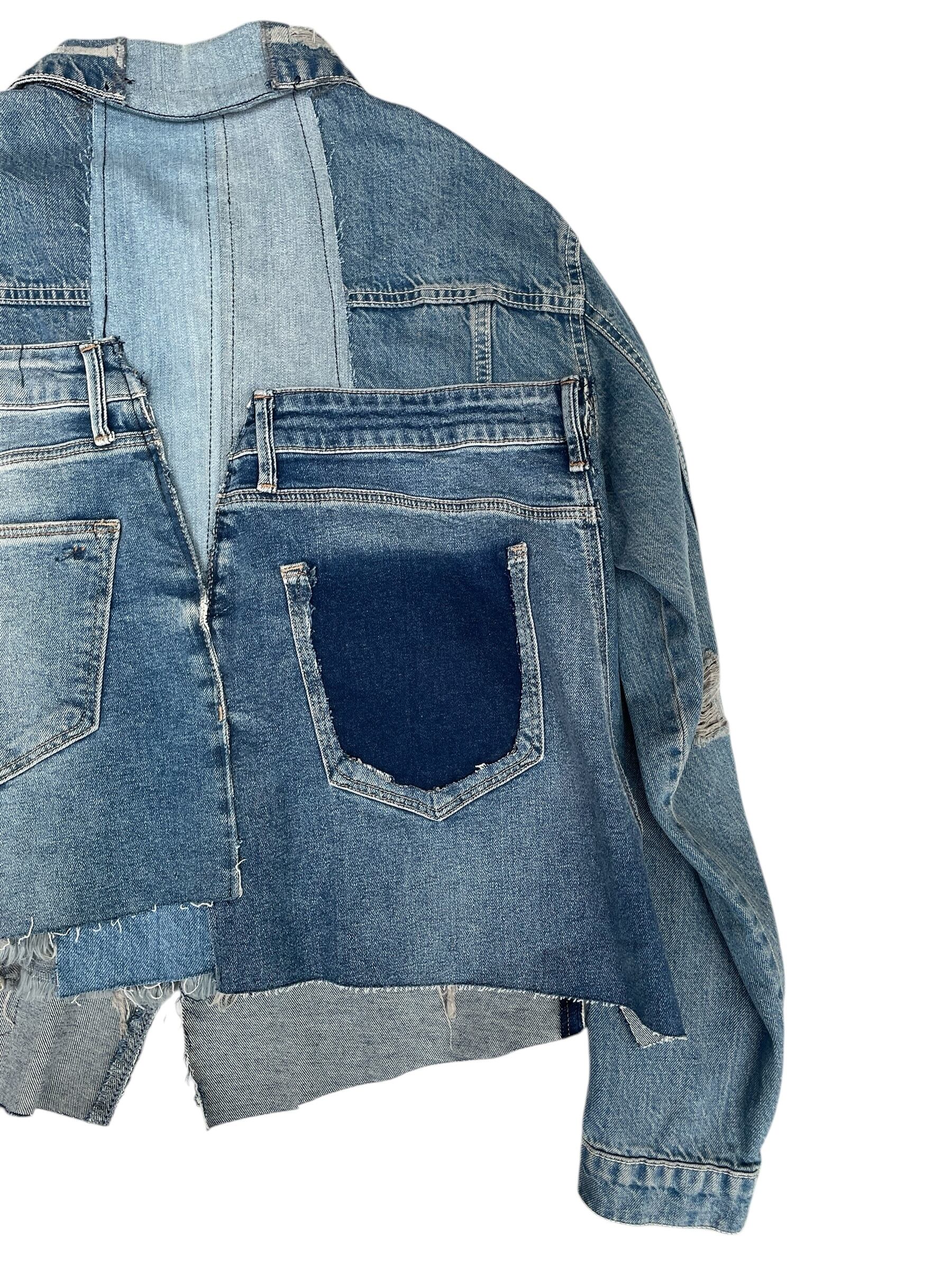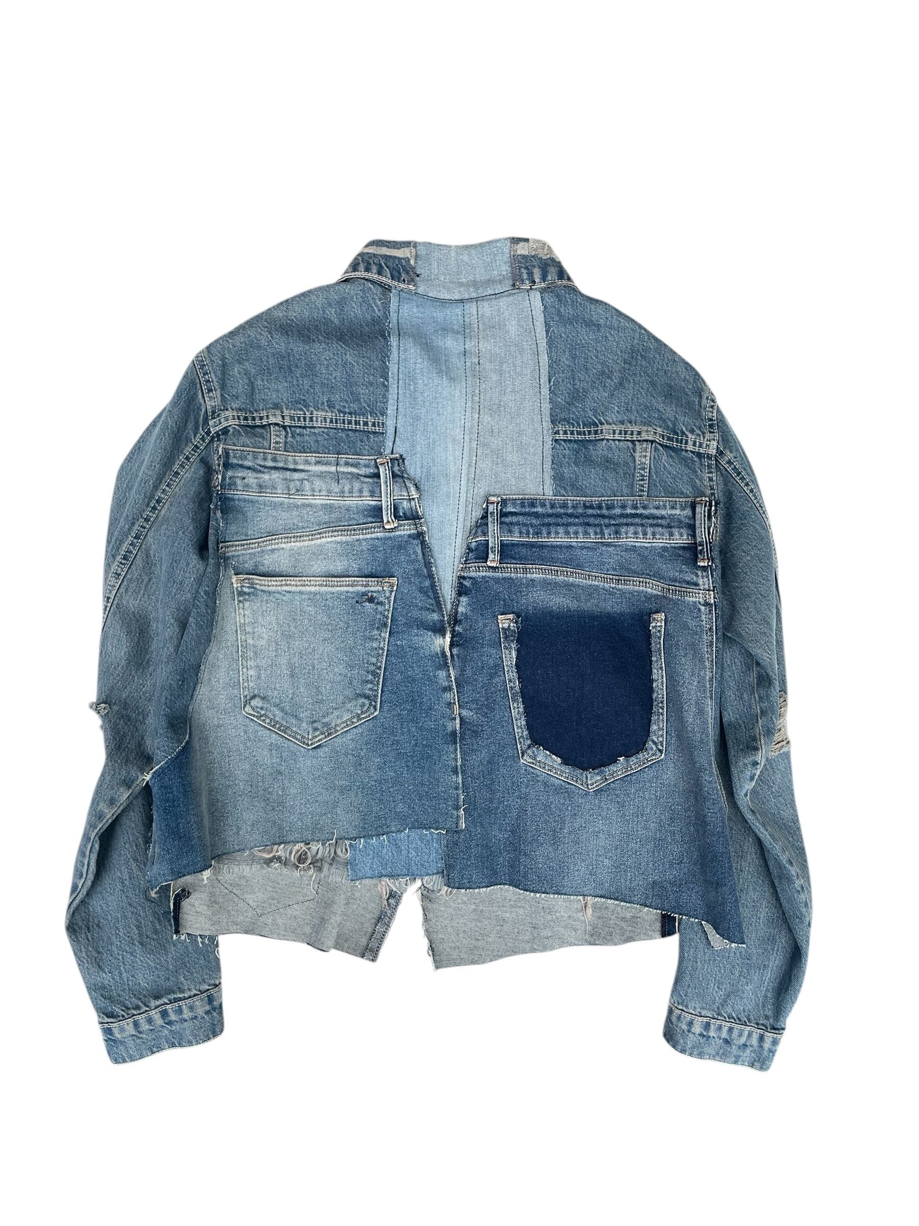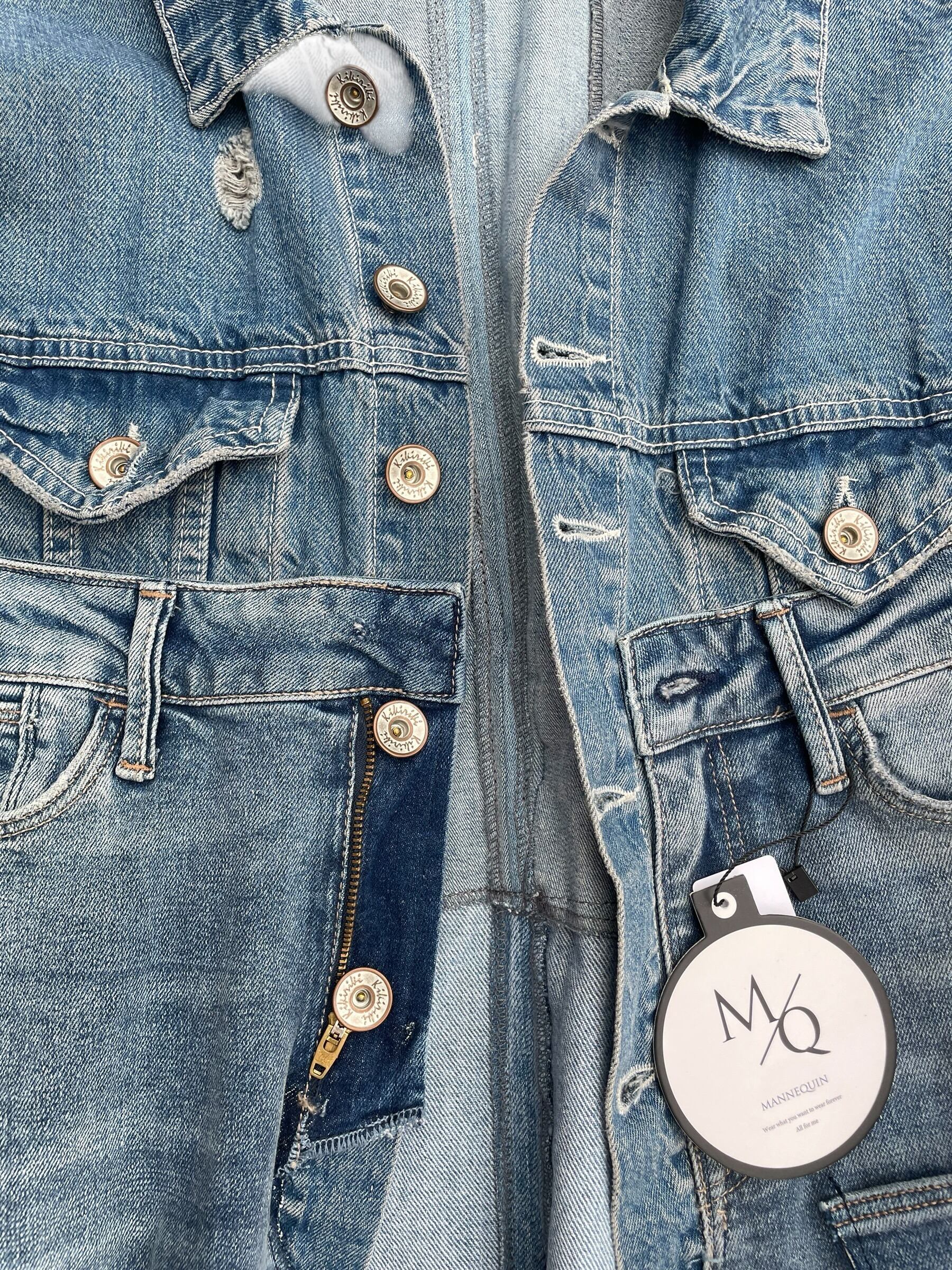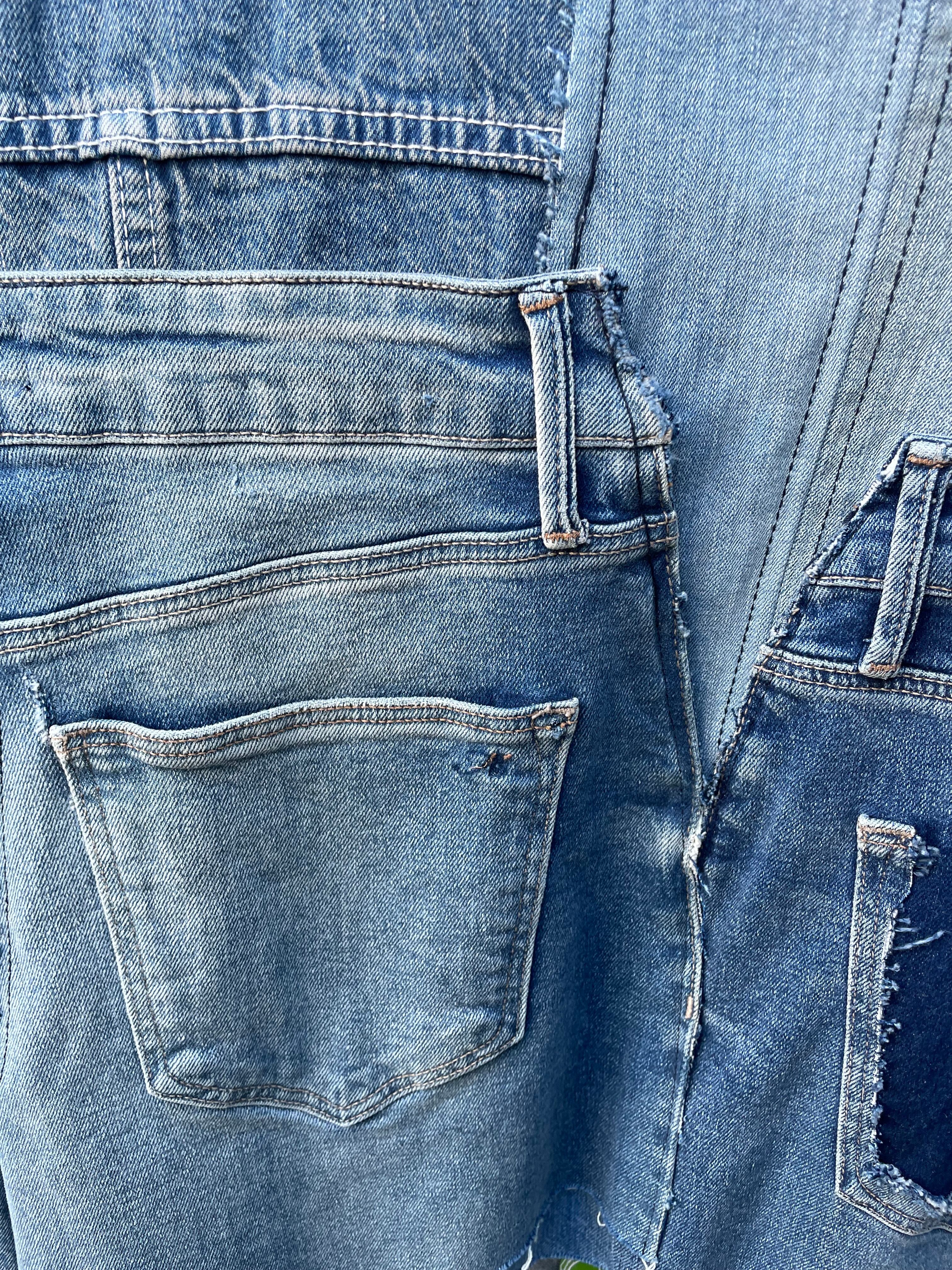 ビンテージなデニムのウォッシュとツギハギなパンツとジャケットを一体化した最高のリメイク仕立てが特徴的なジャケットです。