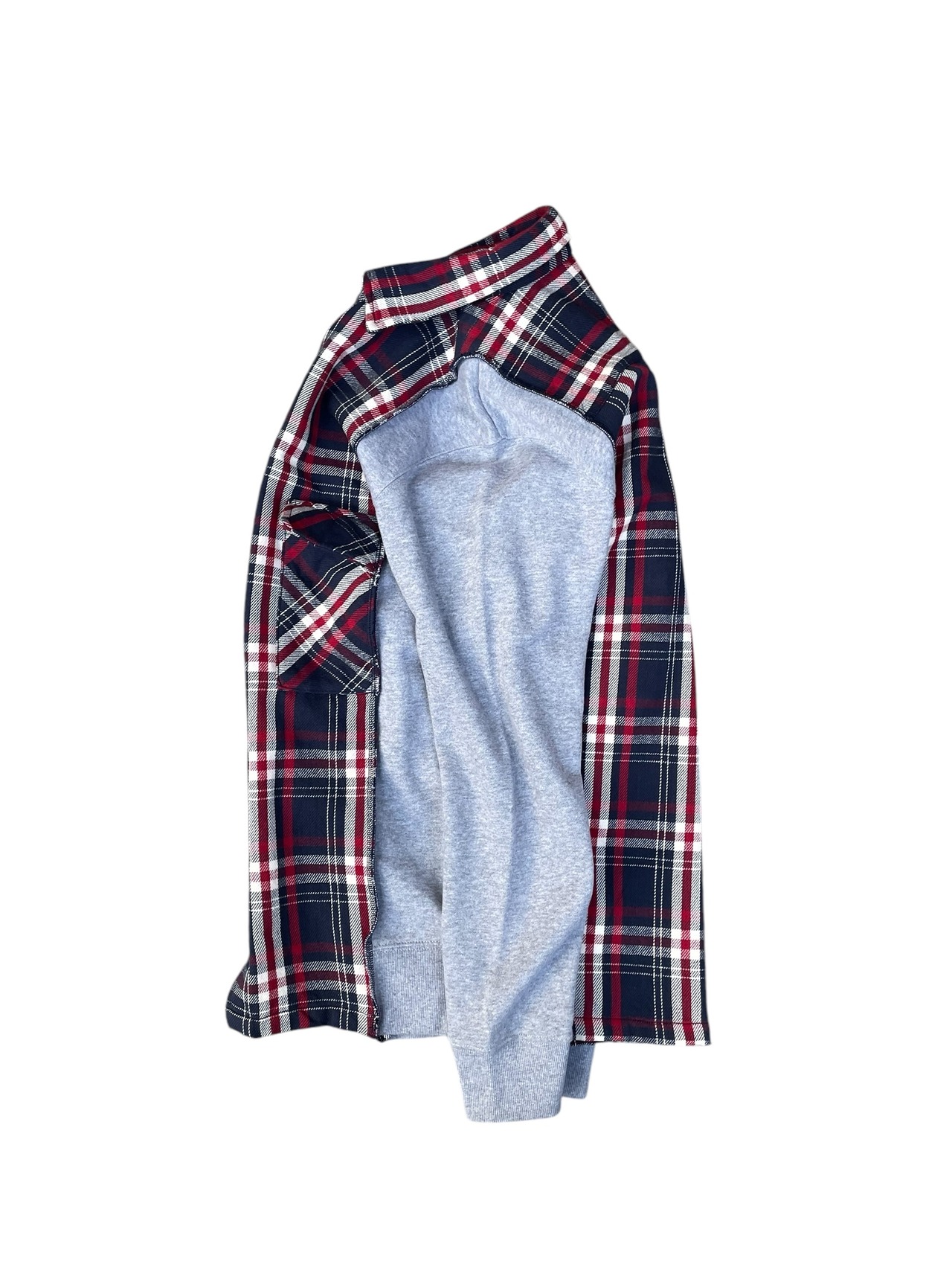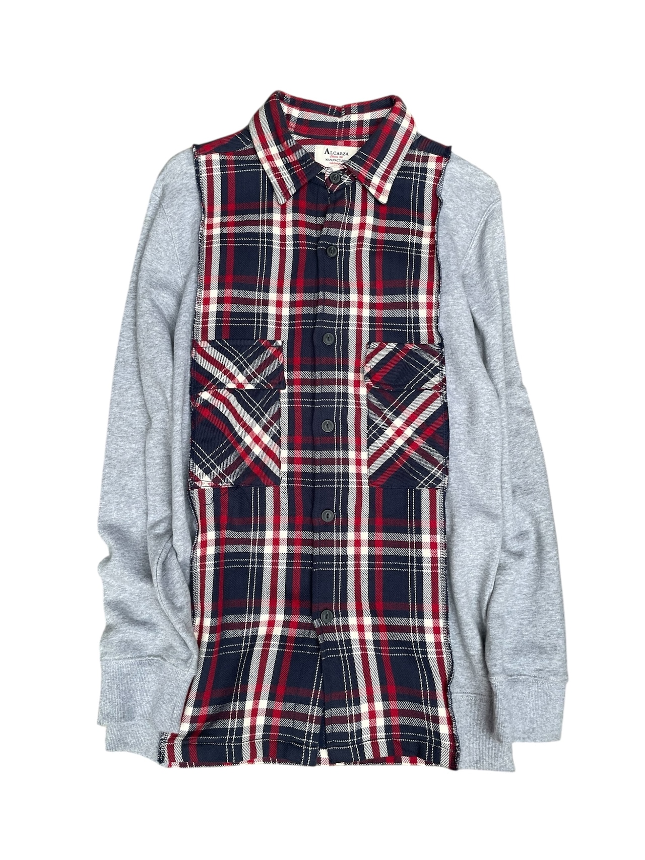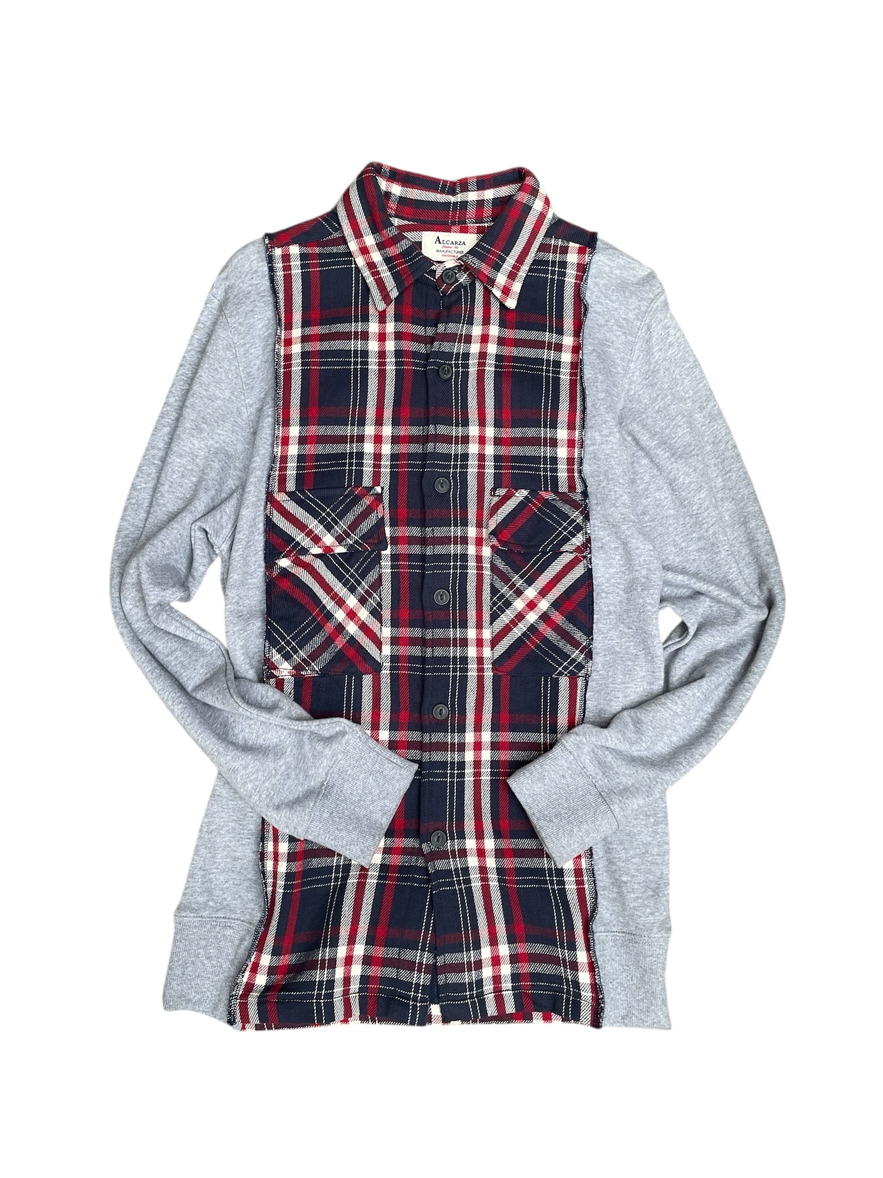 ビンテージのネルシャツにトレーナーを繋げた逸品。古着のリメイクになります。傷や擦れ等ございます。予めご了承ください。